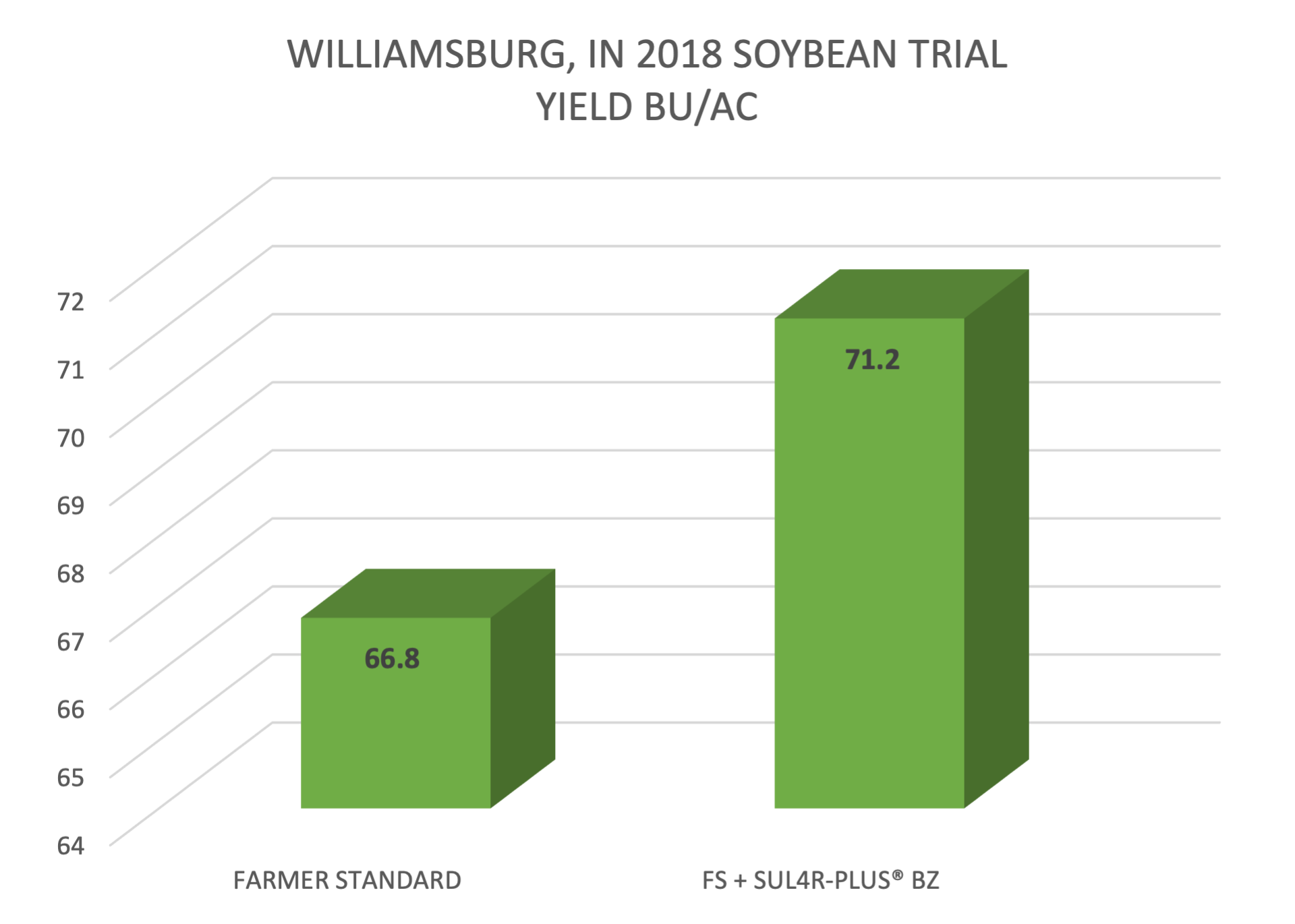 In a 2021 soybean trial in Nebraska, SUL4R-PLUS fertilizer showed an average yield advantage of 3.65 bu/acre above AMS and 5.12 bu/acre over Grower Standard. It’s also more affordable per acre than AMS, giving you more bang for your buck. For even higher yields, try SUL4R-PLUS B+Z, which supplies additional nutrients to your crop making them stronger and healthier. With the addition of calcium, sulfur, boron and zinc, a 2018 soybean trial in Williamsburg IN found increased yield and gross revenue per acre versus the grower standard.