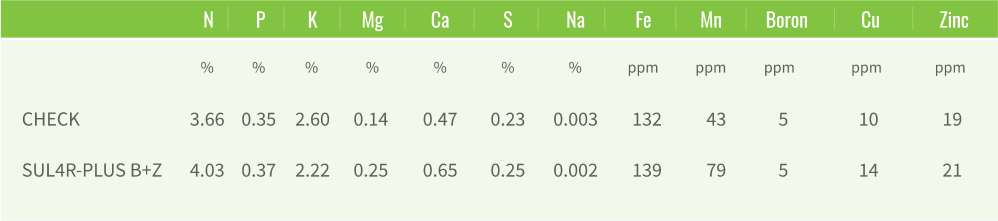 It turns out the SUL4R-PLUS people were telling the truth. We saw elevated calcium and sulfur levels in the V-8 tissue samples and a 9 bu/acre yield increase of corn at harvest. I am looking forward to using SUL4R-PLUS B+Z product this coming season.
